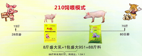 210仔豬大保育飼喂模式,適用于以出售仔豬的豬場: 1窩小豬(以10頭計)從教槽開始采食:2包(20kg/包)盛大乳+10包(40kg/包)盛大951顆粒 目標實現:80日齡每窩小豬(以10頭計)共用料880斤可以長570斤豬,料肉比1.54:1