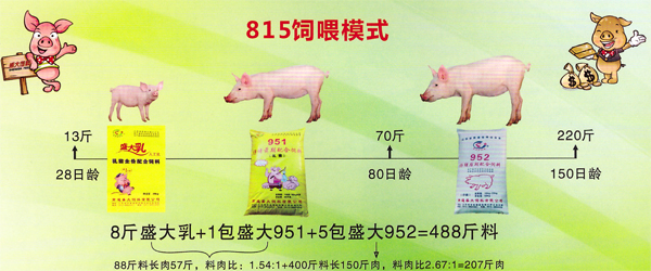 815豬場飼喂模式,自繁自養并出售肥豬的大牧場: 每頭小豬從教槽到出欄采食:8斤盛大乳+1包盛大951乳豬顆粒(40kg/包)+5包盛大952仔豬顆粒(40kg/包) 目標實現:150日齡220斤左右的增重 實踐證明:采用815飼喂模式:前期88斤料長57斤豬,后期400斤料長150斤豬,全程150天長220斤豬,料肉比2.36:1